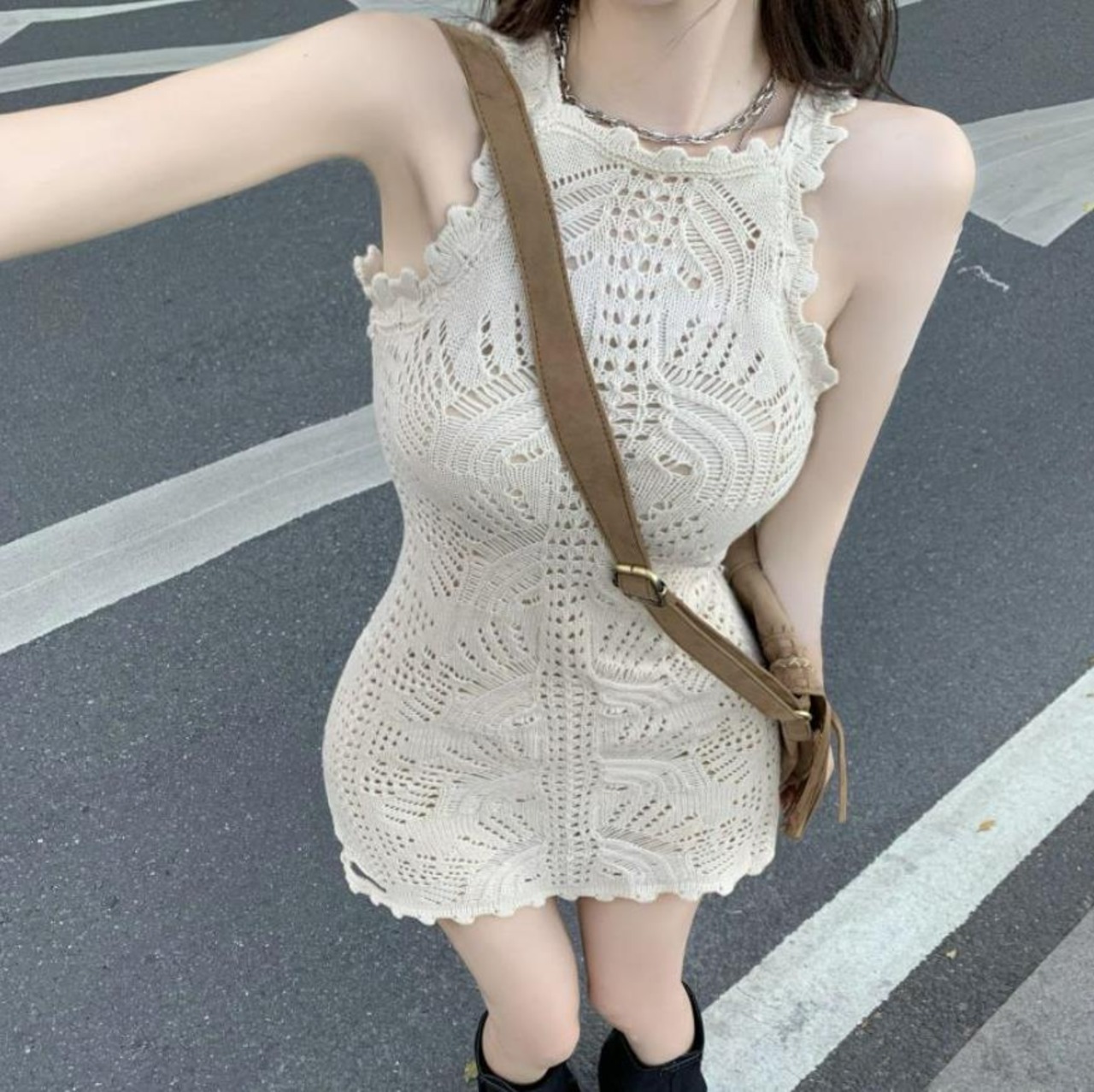 春夏新作 女 レディース ハイウエスト 袖なし 吊りスカート ミニ ニットワンピース ドレス タイトスカート