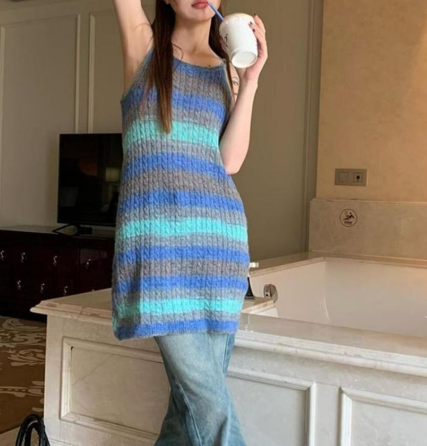 春夏新作 女 レディース ハイウエスト 袖なし ニット 吊りスカート ミニ ワンピース ドレス タイトスカート