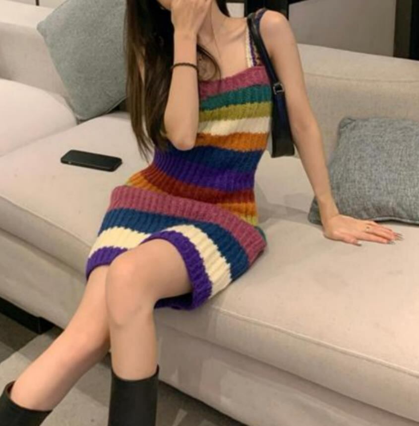 春夏新作 女 レディース ハイウエスト 袖なし 吊りスカート ミニ ニットワンピース ドレス タイトスカート