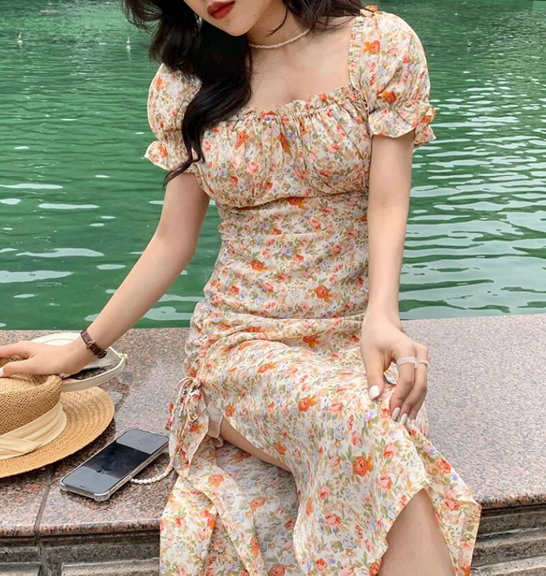 2023春夏新作 女 レディース ハイウエスト 半袖 パフスリーブ ロング ワンピース 台型スカート