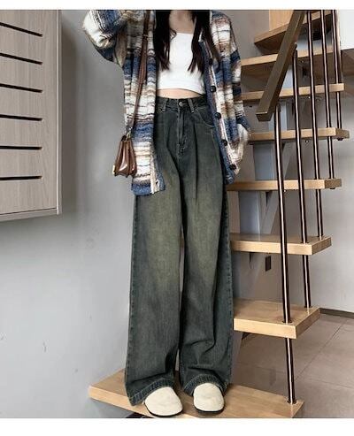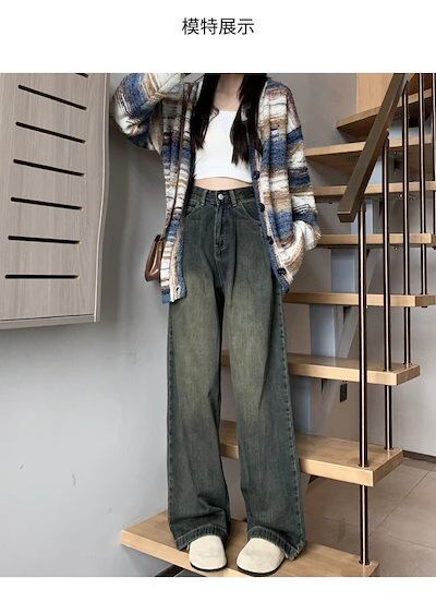 デニムパンツ セメントグレーレトロワイドレッグジーンズレディースニューハイウエストルーズシンストレートドレープドラッグパンツ