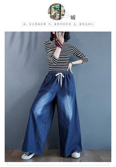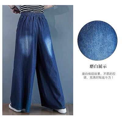 「ファットガール」 秋冬 デニムパンツ ゴム ワイドパンツ ハイウエスト 大きいサイズ ゆったり フレア レディース ロングパンツ
