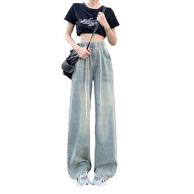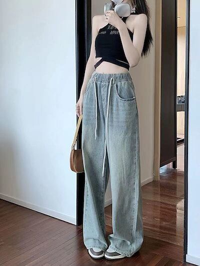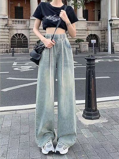 【3日以内出荷】スラックスパンツ デニム レトロ ゴムウエスト ドローストリング レディース 夏&秋 ハイウエスト 学生 ストレート ワイドパンツ 韓国