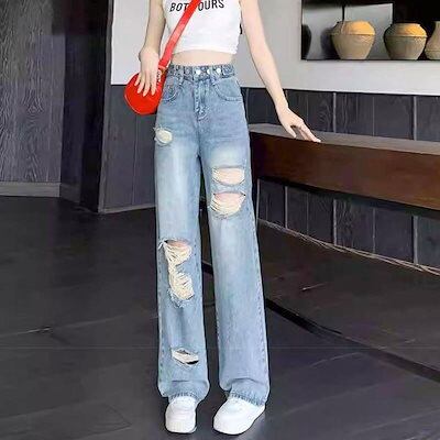 大人気 デニムパンツ 秋 新作 マルチボタンアジャスタブル 着痩せ 女性乞食デザイン壊れた穴ルーズ夏ハイウエストストレートワイドレッグドラッグパンツ レディース 脚長効果 美脚効果 | gizshop