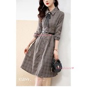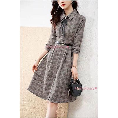 レディース きれいめ 膝丈ワンピース 春秋 長袖ワンピース チェック柄 リボン Aラインスカート オ