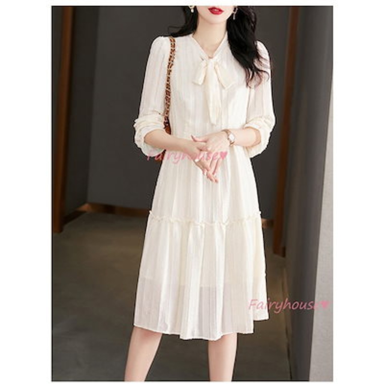 ワンピース レディース 40代 きれいめ 膝丈ワンピース 春夏 長袖ワンピース 白 リボンネック Aラインスカート オシャレ韓国風 大人 通勤OL 結婚式ドレス 30代