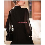 ワンピースレディース 40代 きれいめ 膝丈ワンピース 春秋 長袖ワンピース パフスリーブ 黒シフォンスカートAライン オシャレ大人 着痩せドレス ゆったり30代