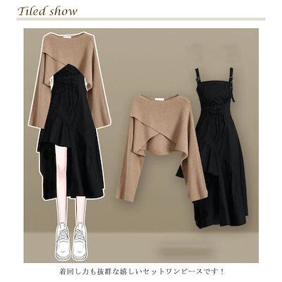 新入庫 ニット セットアップ レディース ニットセーター 長袖 ワンピース 2点セット クロス ニットトップス フレアロングワンピース 上下セット Aラインワ