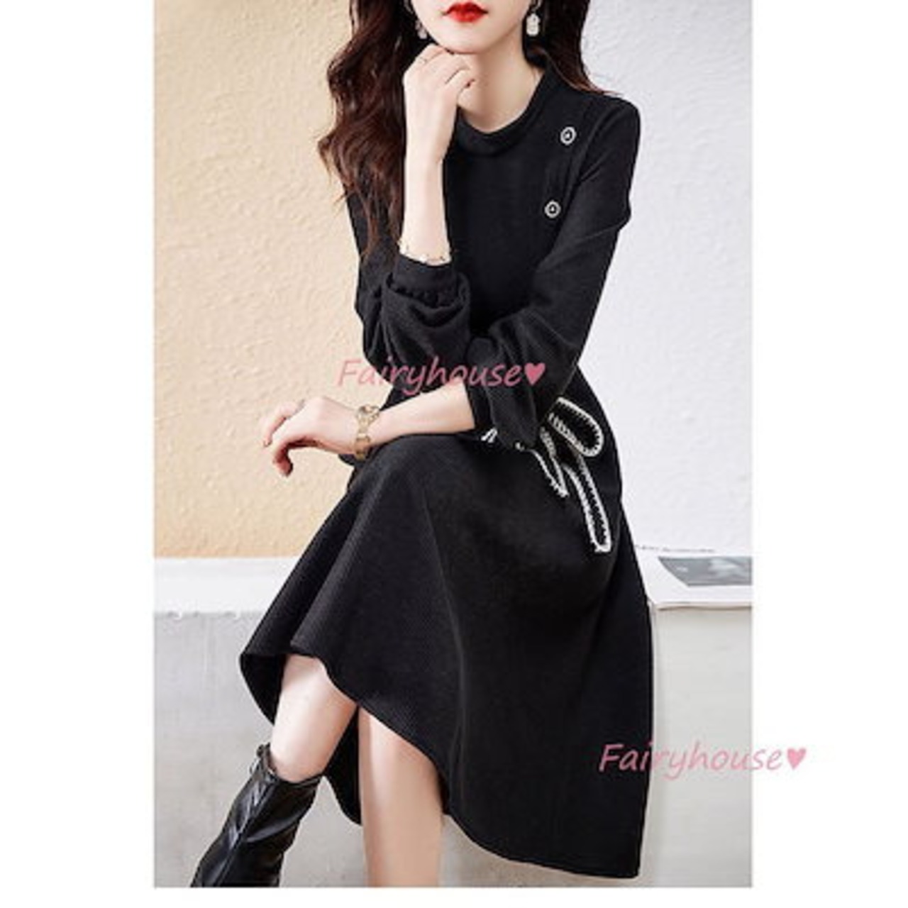 ワンピース レディース 40代 きれいめ 膝丈ワンピース 秋冬 長袖ワンピース 黒リボン Aラインスカート オシャレ大人上品 通勤OL 入学式 卒業式 50代ドレス