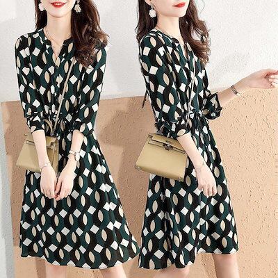 シャツワンピース レディース 40代 きれいめ 膝丈ワンピース 春夏 長袖ワンピース プリント Vネック aラインスカート オシャレ韓国風 大人 通勤OL 30代 50代