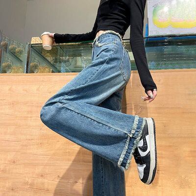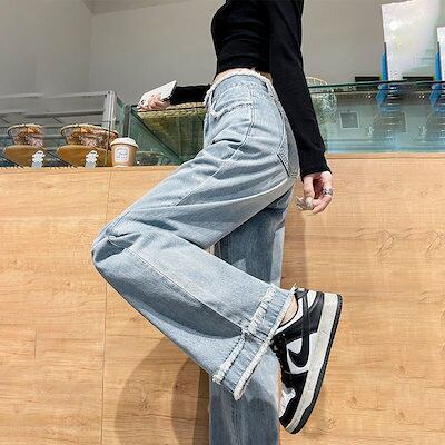 【3日以内出荷】脚長効果!デニムパンツ ハイウエスト ワイドパンツ レディース 小さい ゆったり 薄手 2025年春の新作 ドレープ ストレートパンツ 韓国ファッション