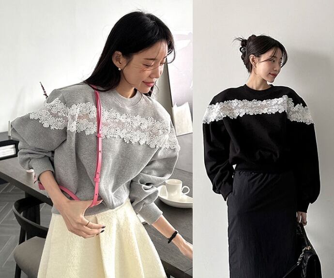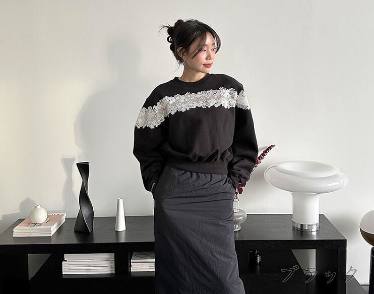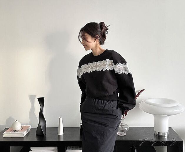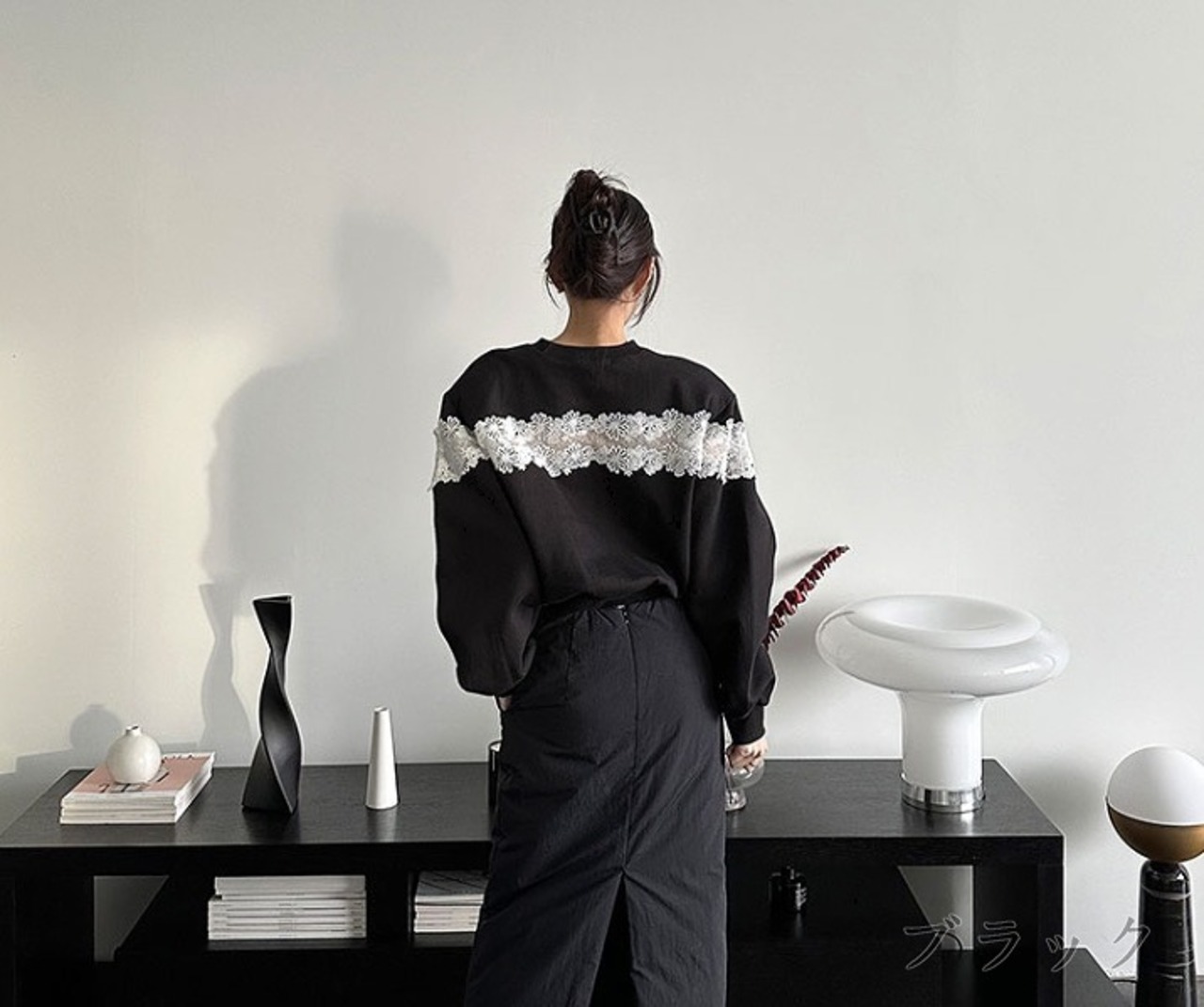 全2色 スウェット トレーナー 長袖 切り替え 体型カバー 着痩せ レース シンプル