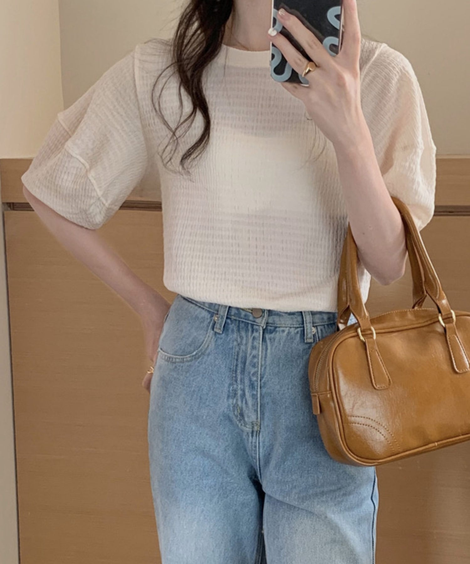 パフスリーブ ジャガード 半袖トップス ma 【即納】 ブラウス レディース 韓国 プチプラ おしゃれ