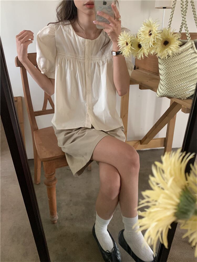 簡単スタイルアップ トップス 小さい新鮮な sweet系 大人気 スクエアネック 縫付 半袖ブラウス