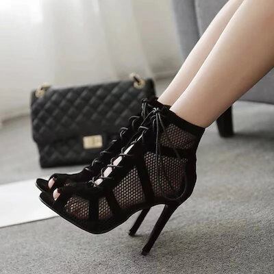 スタイルアップ!ヒールパンプス 2025新しい黒ネットスエードファッションクロスストラップセクシーなハイヒールプラスサイズ女性の靴