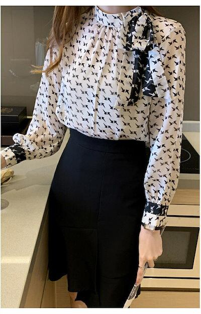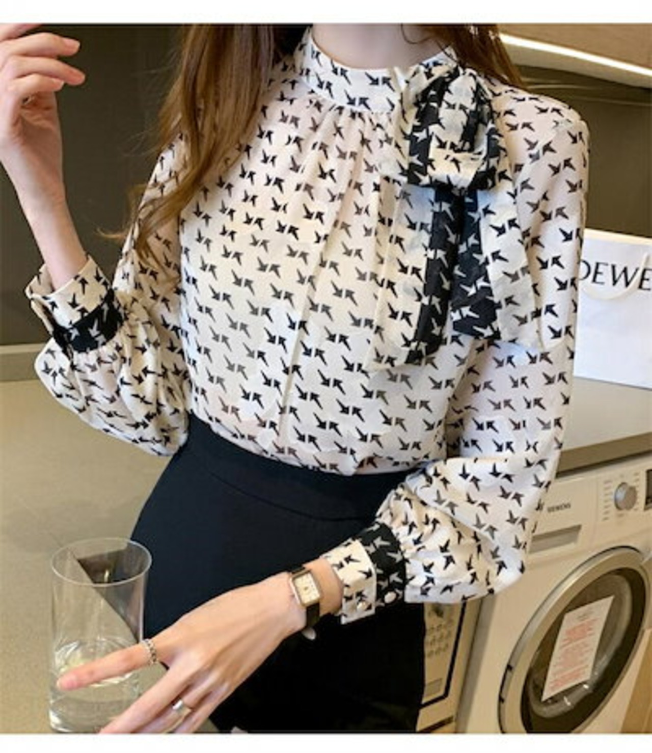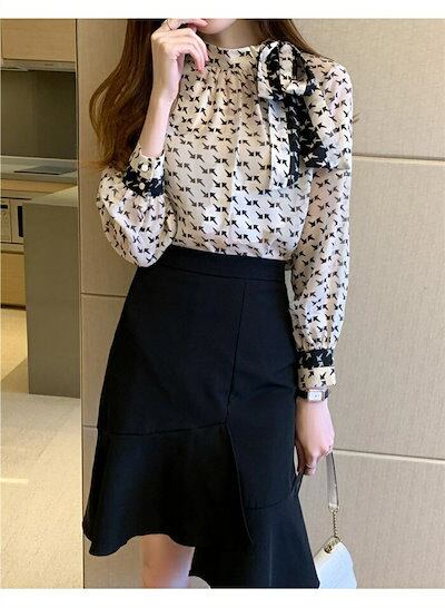 ブラウス シャツ トップス レディース 春秋 シャツブラウス 花柄シャツ 花柄ブラウス 長袖 春 長袖シャツ 長袖ブラウス リボン付き プルオーバー プチハイネック ギャザー シフォンブラウス エレガ | gizshop