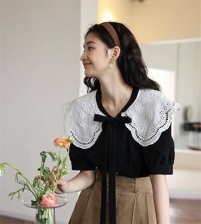 シャツ レディース 半袖 春 夏 秋 春夏秋 シャツブラウス レディースシャツ 無地 ビッグカラー リボン ギャザー パフ袖 パフ袖 可愛い カワイイ 若見え エレガント 配色 レイヤード 重ね着 カ | gizshop