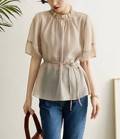 シースルー ブラウス 夏 レディース パフスリーブ ボリューム袖 シアー シースルーブラウス ギャザー ブラウス 半袖 無地 リボン付き フリルネック プルオーバー 大人 フェミニン ゆったり ゆる | gizshop