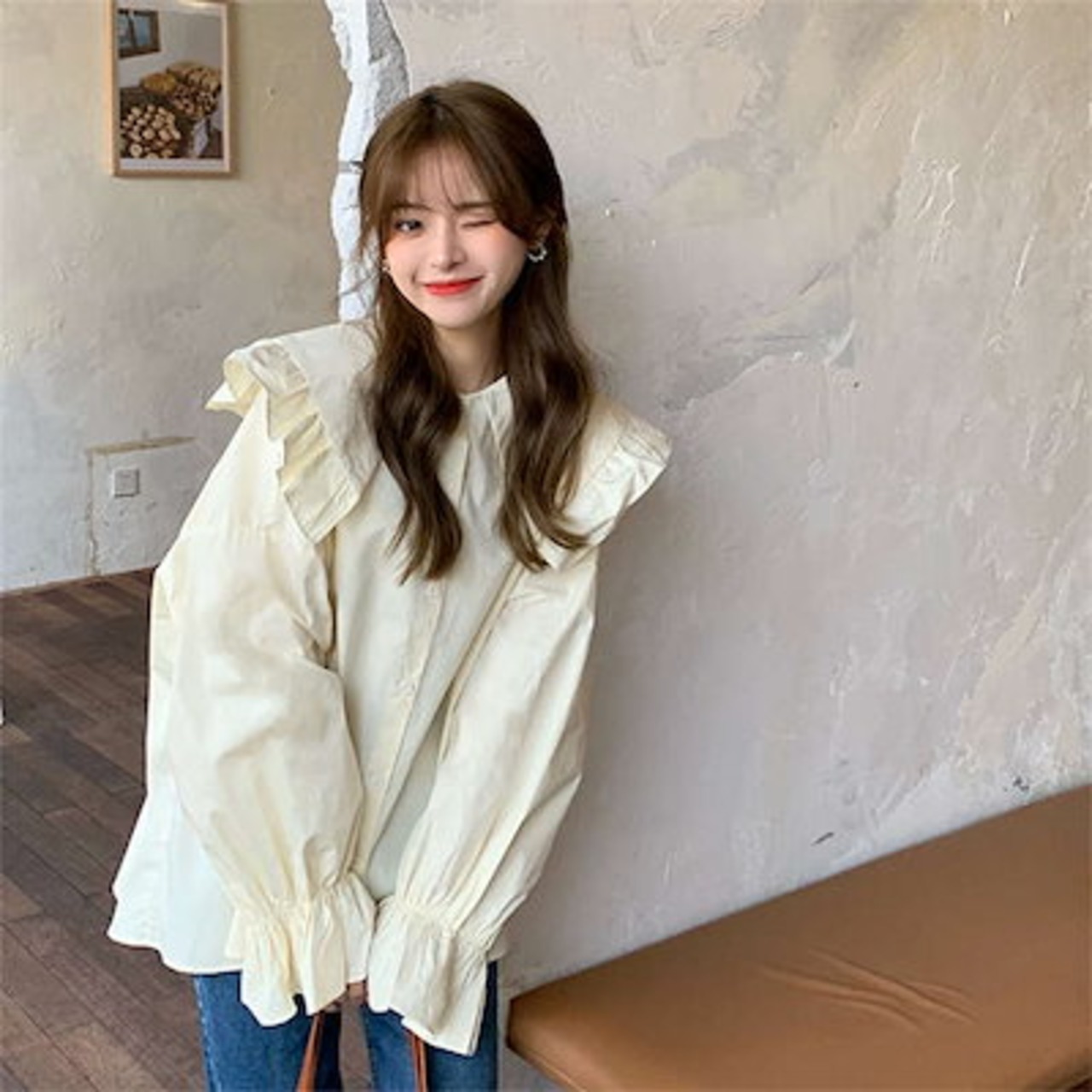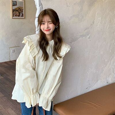 シャツブラウス 長袖ブラウス レディース トップス ビッグ襟 ビッグカラー シャツ フリル ボリュームスリーブ ブラウス おしゃれ 長袖 春 秋 無地 フリル ガーリー かわいい カジュアル お洒落 | gizshop