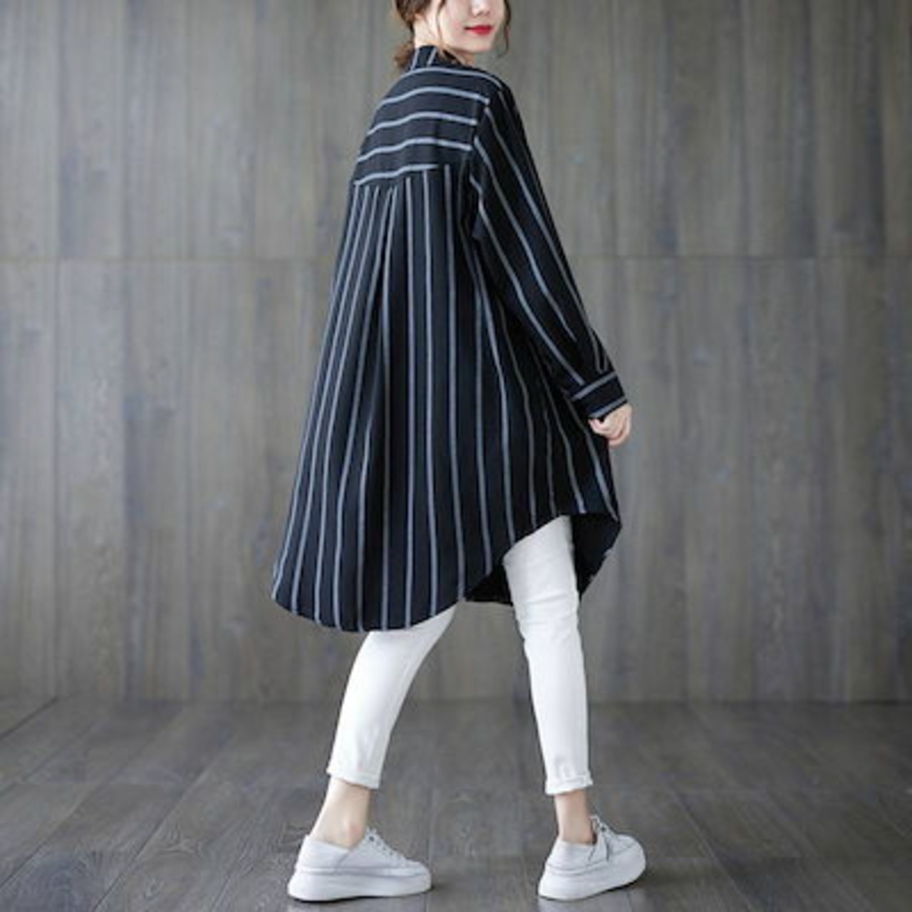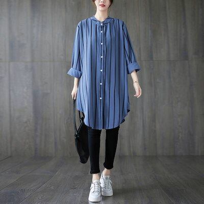 ロングシャツ シャツ チュニック ワンピース 長袖シャツ レディース トップス 羽織り シャツブラウス 膝丈 夏 春 秋 長袖 立ち襟 ストライプ柄 薄手 前開き ゆったり 体型カ | gizshop
