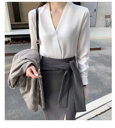 Vネック ブラウス レディース シャツ 長袖 フォーマル トップス 胸元タック 美フォルムゆるシャツ 通勤 オフィス 上品 トレンド シフォンジョーゼット 春夏 Vネックシンプル 無地 カジュアル 通