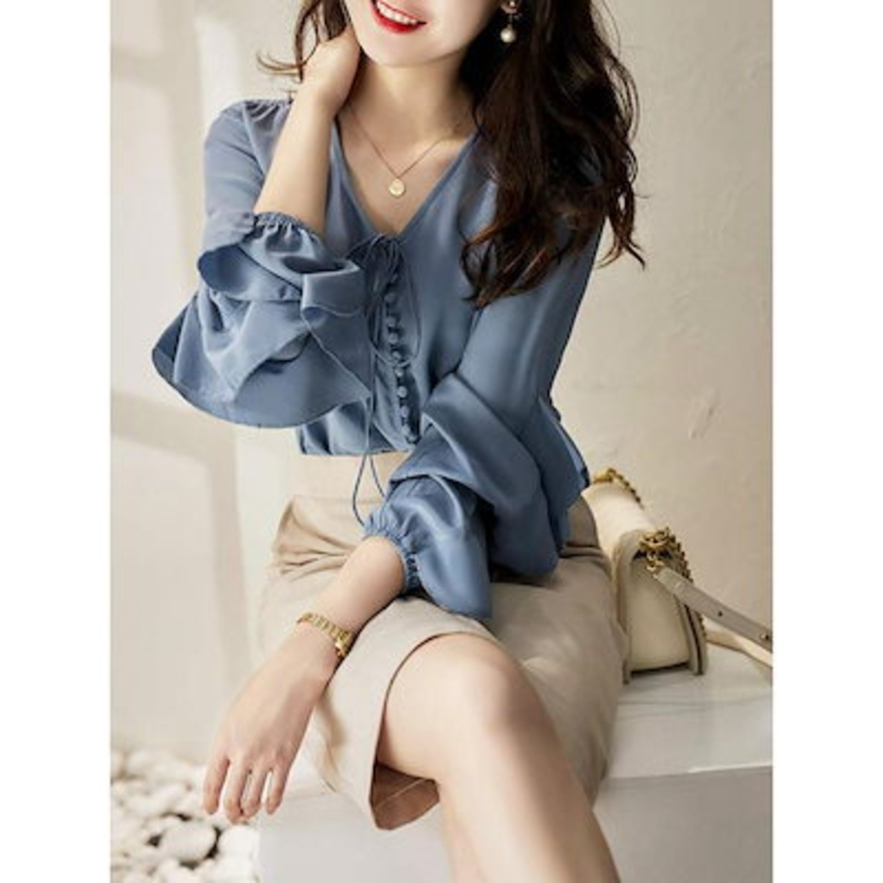 ブラウス レディース 40代 春夏新作 オシャレブラウス シフォンシャツ 長袖トップス vネック パフスリーブブラウス 大人 ゆったり シャツ 30代 50代