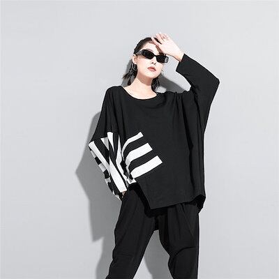 ドルマンスリーブ トップス レディース tシャツ 長袖 おしゃれ アシンメトリー tシャツ ボーダー 柄 カットソー 春 秋 冬 配色 プルオーバー スウェット トレーナー ゆったり 体型カバー 無地
