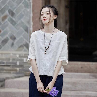 リネン混 tシャツ レディース 半袖 ゆったり 春 夏 無地 森ガール 大人 ナチュラル クルーネック 春夏 大きいサイズ 切り替え カジュアル シンプル リラックス トップス プルオーバー 着痩せ | gizshop