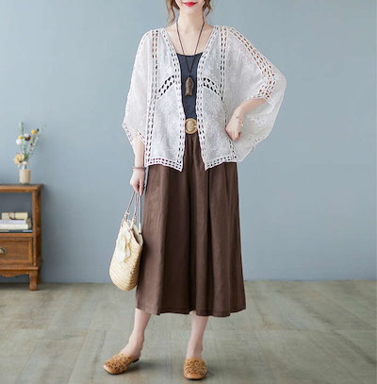カーディガン 刺繍 レディース 春 夏 薄手 トップス きれいめ 夏 羽織り サマー アウター カーデ ショート丈 やわらかい UV対策 紫外線対策 冷房対策 着やせ ゆったり 透かし雕り 無地 白