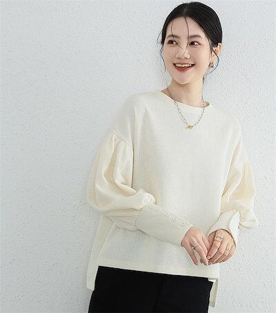 ぽわん袖 スウェット レディース おしゃれ トレーナー 秋 春 ゆったり プルオーバー 春秋 トップス パーカー 長袖 クルーネック パフスリーブ 無地 裾 スリット 前後差 カジュアル トップス t