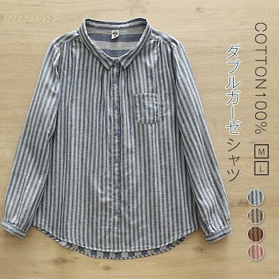 ガーゼ シャツ 綿 秋 春 シャツブラウス レディース ストライプ ブラウス 長袖 ガーゼシャツ トップス ガーゼコットン カジュアル ナチュラル 小顔効果 ダブルガーゼ 2重ガーゼ 大きいサイズ 体 | gizshop