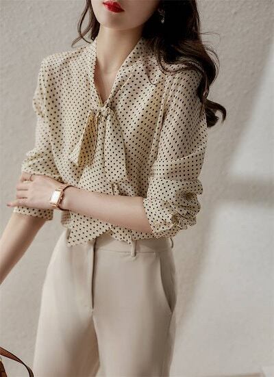 ブラウス レディース 長袖 トップス 夏 レディースブラウス 柄トップス 柄シャツ 春 春夏 長袖ブラウス シャツブラウス スカーフカラー ボウタイ ドット 着回し 柄 がら 知的 着痩せ 華奢見え | gizshop