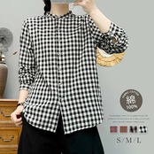 チェック ガーゼシャツ レディース 春秋 長袖 綿 秋冬 ダブルガーゼ バンドカラー シャツブラウス トップス カジュアル ナチュラル 2重ガーゼ シンプル ギンガムチェック 通勤 通学 羽織り 春