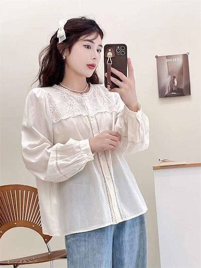 刺繍 シャツ ブラウス レディース 春秋 長袖 フリル襟 可愛い 綿 秋冬 シャツブラウス トップス カジュアル ナチュラル おしゃれ シンプル 通勤 通学 羽織り 春 秋 オフィス お洒落 コット