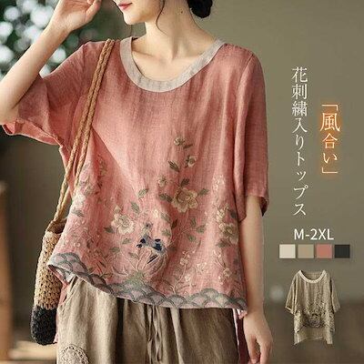 ブラウス 夏 レディース 5分袖 シャツブラウス レディースブラウス トップス キレイめ カジュアル 柄ブラウス 春夏 大人 花柄 柄 クルーネック 裾前後差 薄手 刺繍 刺繍入り ししゅう 楽ちん | gizshop