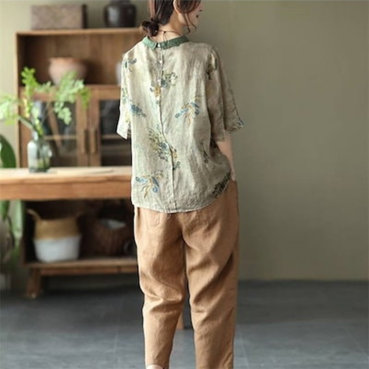 ブラウス 夏 レディース 5分袖 コットン リネン シャツブラウス レディースシャツ トップス チュニック カジュアル 春夏 大人 柄 総柄 丸襟 綿麻混 レトロ 大人可愛い バックデザイン ギャザー