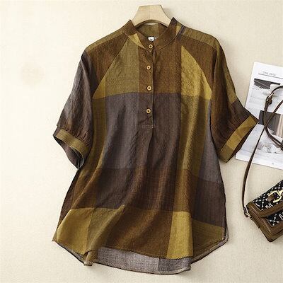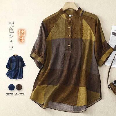 ブラウス レディース シャツブラウス 春 夏 秋 コットン 半袖 半袖ブラウス 柄ブラウス トップス 綿 春夏秋 カジュアル 柄 ギャザー バンドカラー 配色 ナチュラル ゆったり 森ガール 通勤 | gizshop