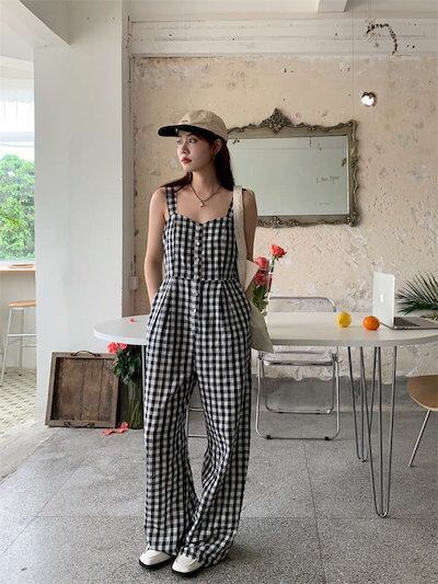 サロペット レディース 夏 春 ゆったり カジュアル オールインワン つなぎ オーバーオール パンツ ワイドパンツ ロングパンツ ワイド ロング 綿 コットン チェック柄 チェック ポケット付き 涼し