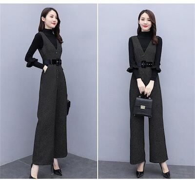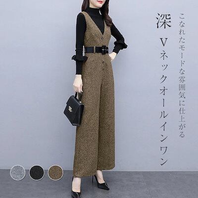 サロペット パンツ レディース ワイドパンツ つなぎ オールインワン 大人 春 秋 冬 深vネック カジュアル シンプル おしゃれ きれいめ 長袖 通勤 セレモニースーツ 入学式 卒業式 卒園式 入園 | gizshop