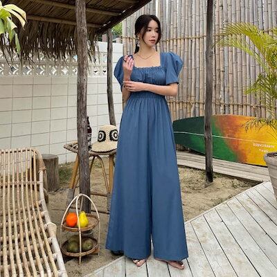 オールインワン レディース サロペット 春 夏 オーバーオール 半袖 パフスリーブ 着痩せ ワイドパンツ 涼しい シンプル ポケット付き ガウチョ パンツドレス ギャザー 体型カバー ゆったり きれい | gizshop