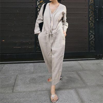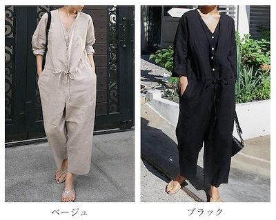 オールインワン レディース サロペット 九分丈 春 夏 ゆったり パンツドレス つなぎ オーバーオール 綿麻 パンツ ワイドパンツ ワイド クルーネック ポケット 無地 コットン 涼しい 体型カバー | gizshop