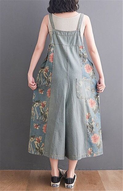 サロペット レディース オールインワン デニムパンツ デニムワイドパンツ デニム ロング丈 ロングパンツ 春 夏 ゆったり 花柄 総柄 体型カバー 大きいサイズ カジュアル 可愛い デニムサロペット | gizshop