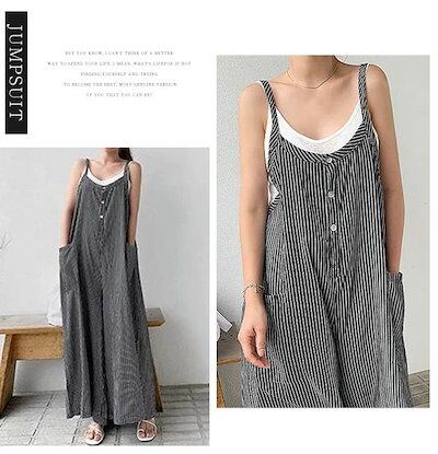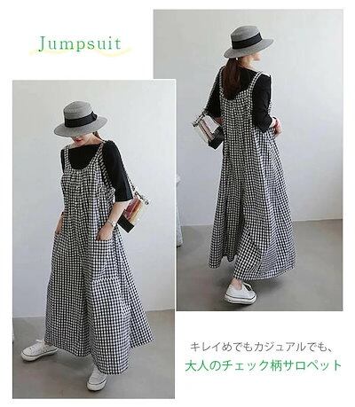 オールインワン サロペット ロングパンツ レディース ワイドパンツ ジャンパー ストライプ チェック ポケット フレア レディース 春夏秋 ゆったり 体型カバー 着?せ 大人 シンブル カジュアル | gizshop