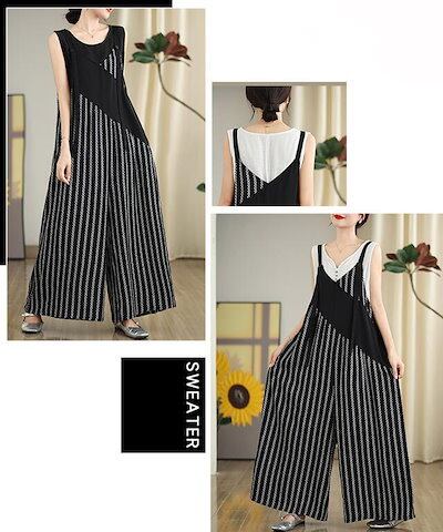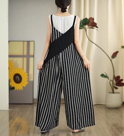 サロペット オールインワン チェック ストライプ パンツ レディース 夏 ワイドパンツ オーバーオール 9分丈 ロング丈 ノースリーブ オーバサイズ おしゃれ 大きめ 春 夏