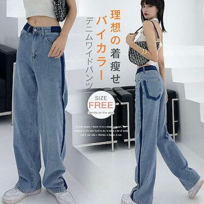 ワイドパンツ デニム レディース 春 秋 ガウチョパンツ ロング丈 バイカラー 華奢見え 体型カバー おしゃれ ゆったり カジュアル ナチュラルカジュアル 着痩せ ボトムス 春物 春 夏 秋 ゆる 大 | gizshop