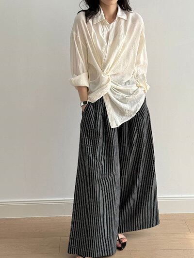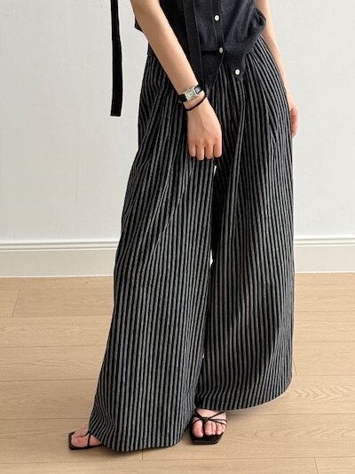 ストライプ パンツ レディース 春 夏 秋 ワイドパンツ 綿麻混 ボトムス 綿麻パンツ パンツ ワイド スラックス ワイドパンツ ストライプ柄 美シルエット ハイウエスト 落ち感 シンプル カジュアル | gizshop