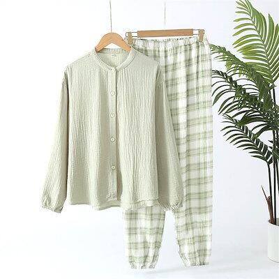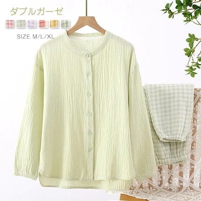 ガーゼ パジャマ レディース ガーゼコットン ルームウェア パンツ 春 秋 春秋 長袖 ダブルガーゼ 2重ガーゼ チェック 綿 部屋着 セットアップ 2点セット ナイト 寝間着 寝巻き 上下セット 前 | gizshop