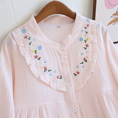 ガーゼ パジャマ レディース ルームウェア パンツ 春 秋 ガーゼコットン 刺繍 花柄 フリル 春秋 長袖 ダブルガーゼ 2重ガーゼ 綿 部屋着 セットアップ 2点セット ナイト 寝間着 寝巻き 上下 | gizshop