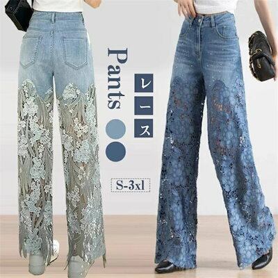デニムパンツ レディース レース デニム 切り替え 春夏秋 透け感 透かし彫り 花柄 ロング丈 ストレートパンツ ジーンズ 体型カバー ボトムス ズボン ゆったり ハイウエスト 着痩 脚長 大きいサイ | gizshop