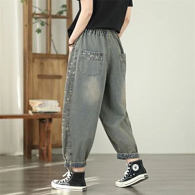 パンツ デニムパンツ レディース 春夏 デニム テーパードパンツ イージーパンツ ウエストゴム ボトムス 楽ちん レトロ ポケット付き 柔らかい ゆったり お洒落 カジュアル 体型カバー 着痩せ 美 | gizshop